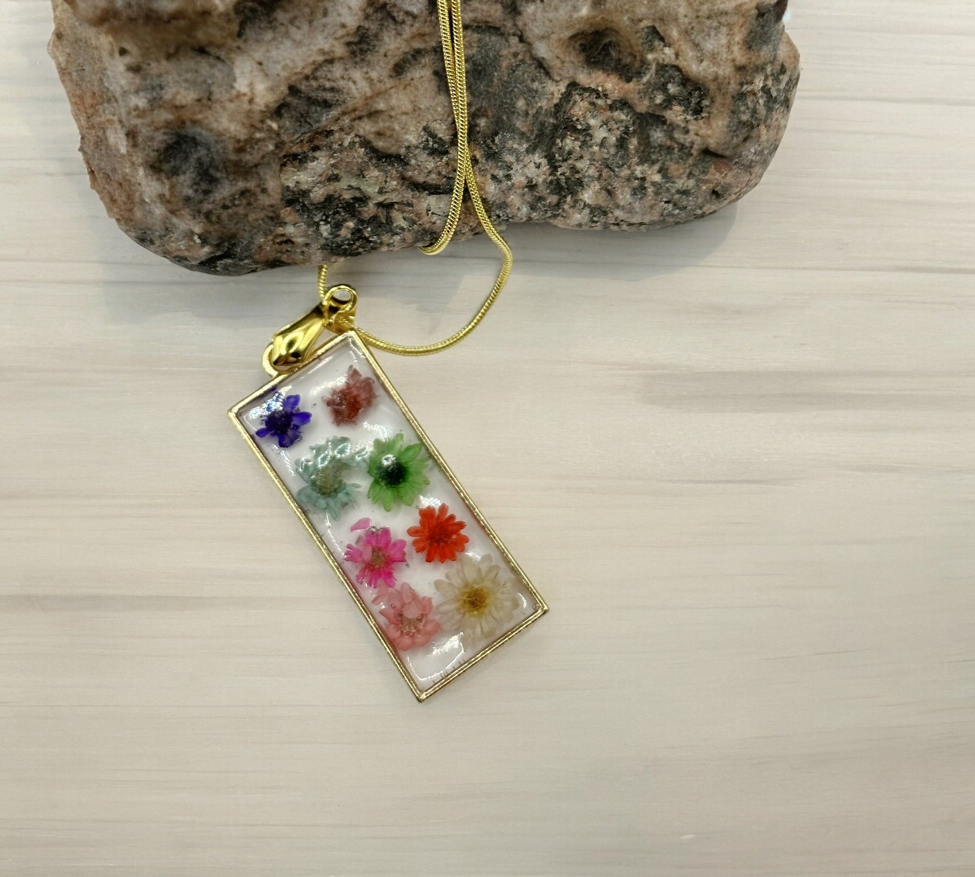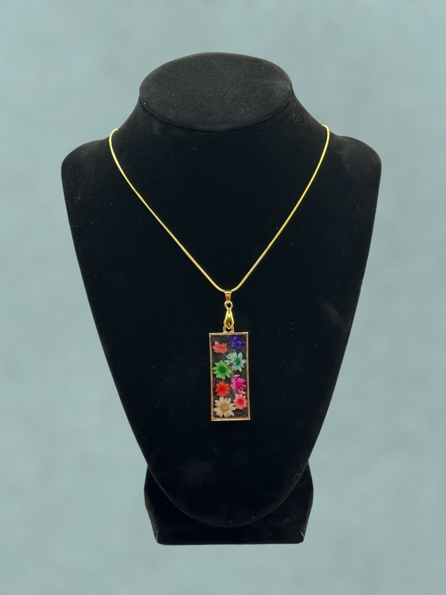 Materials: Handmade with real flowers preserved in clear resin, set in a delicate gold frame, and suspended from a 925 Sterling Silver gold-plated snake chain.