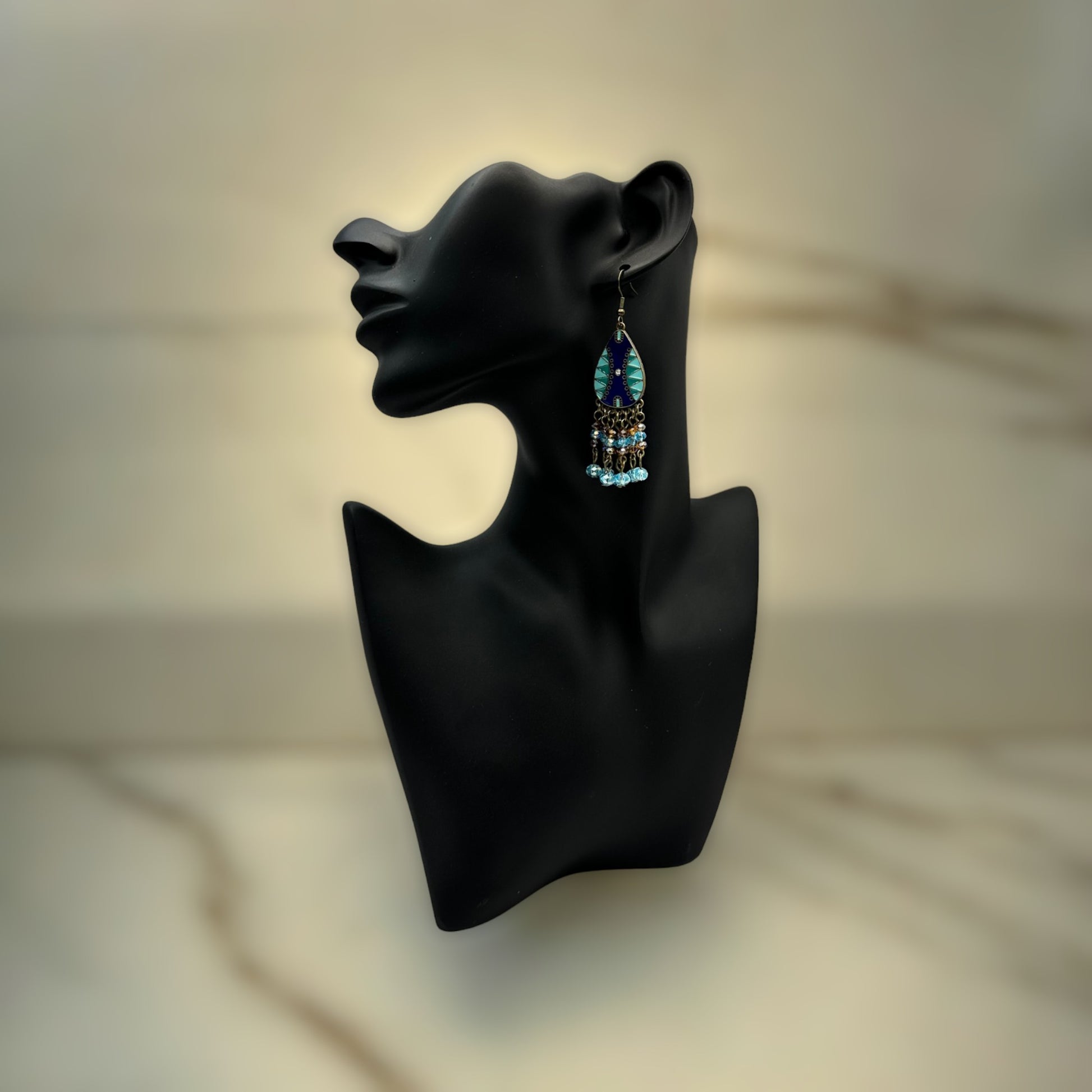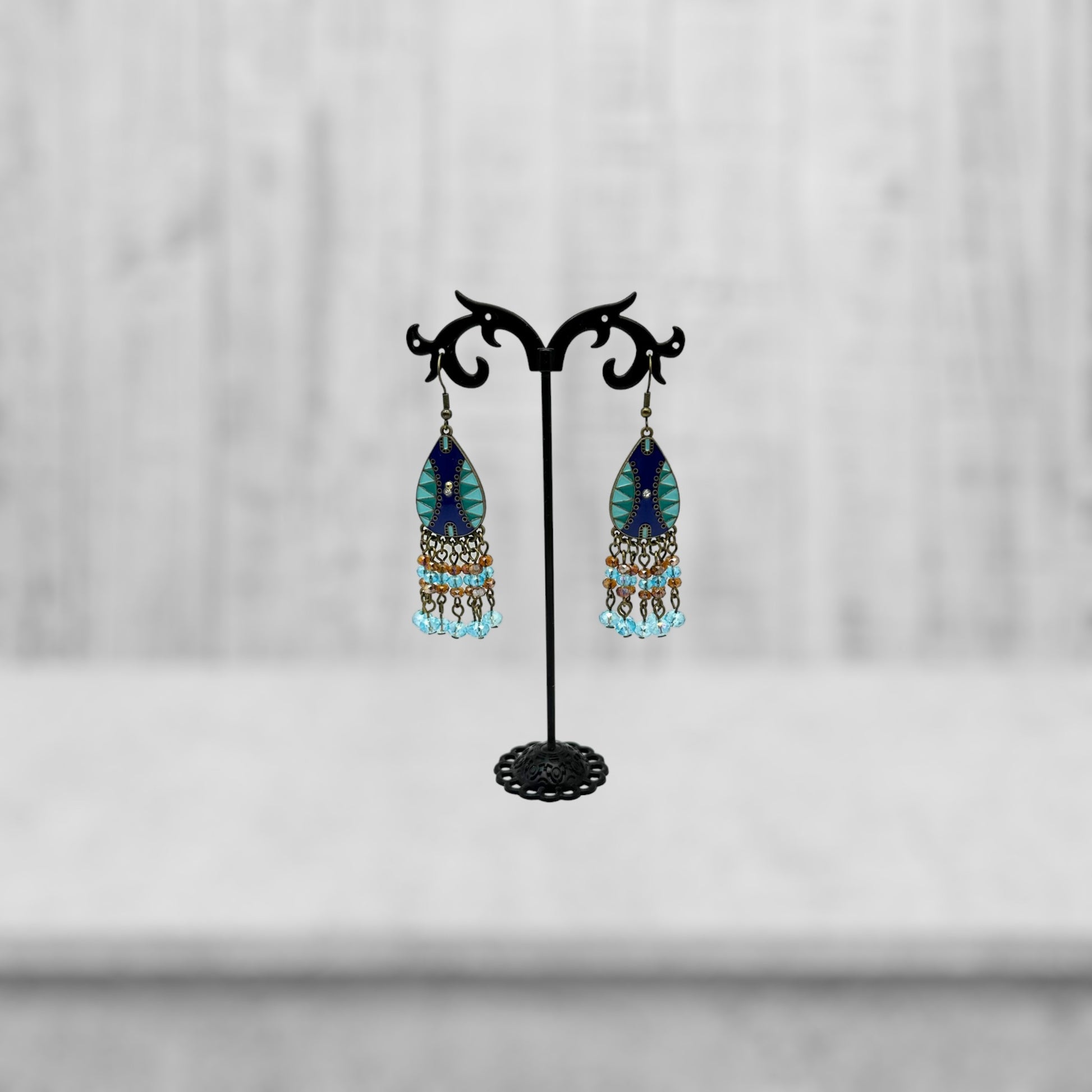 Add a touch of elegance to your ensemble with our stunning Blue and Amber Glass Crystal Earrings. Each pair is meticulously handmade, featuring 6mm and 4mm blue glass crystals alongside 4mm amber glass crystals. The royal blue, aqua, and blue/green teardrop metal focal adds an Aztec flair, making these earrings truly unique and eye-catching.