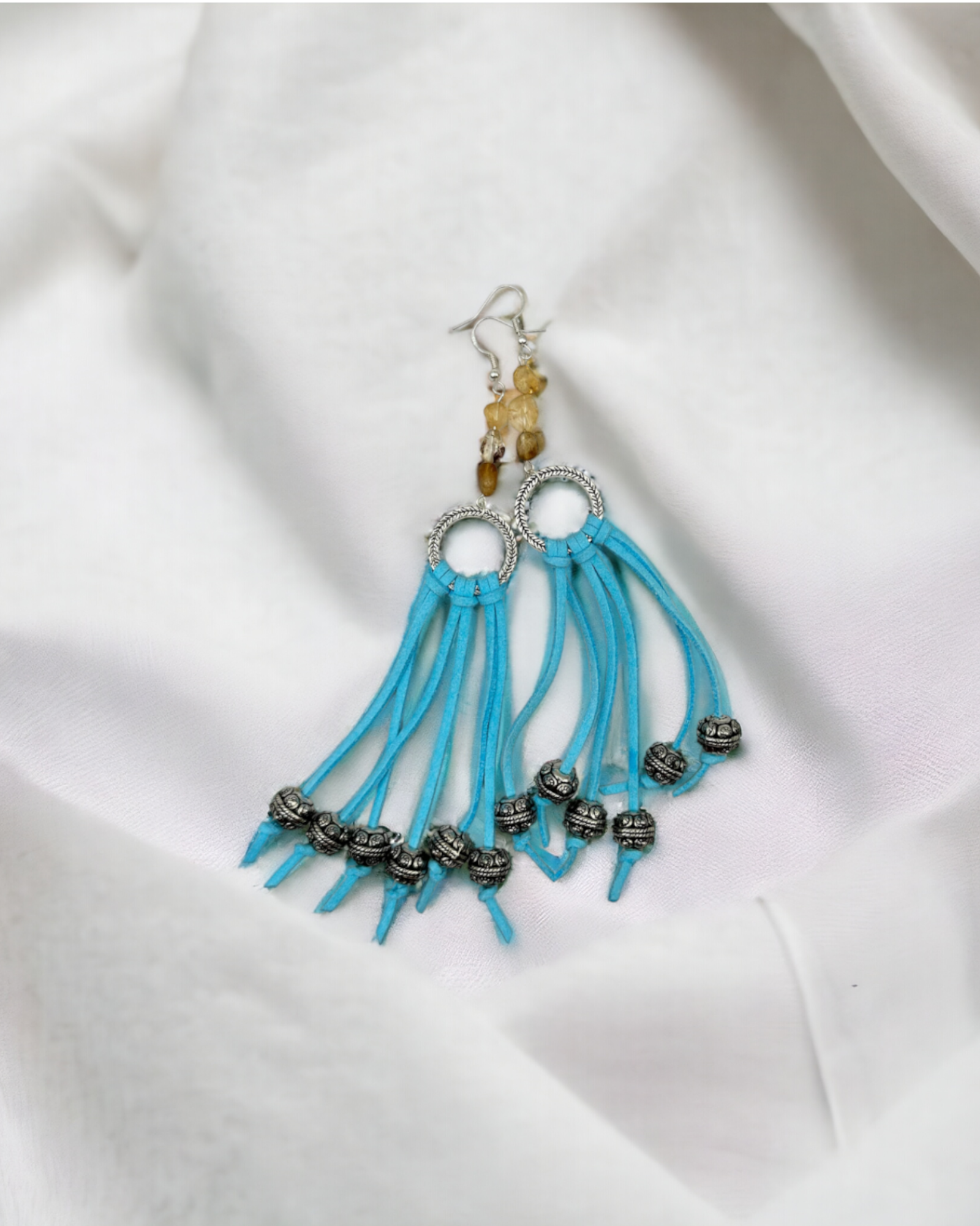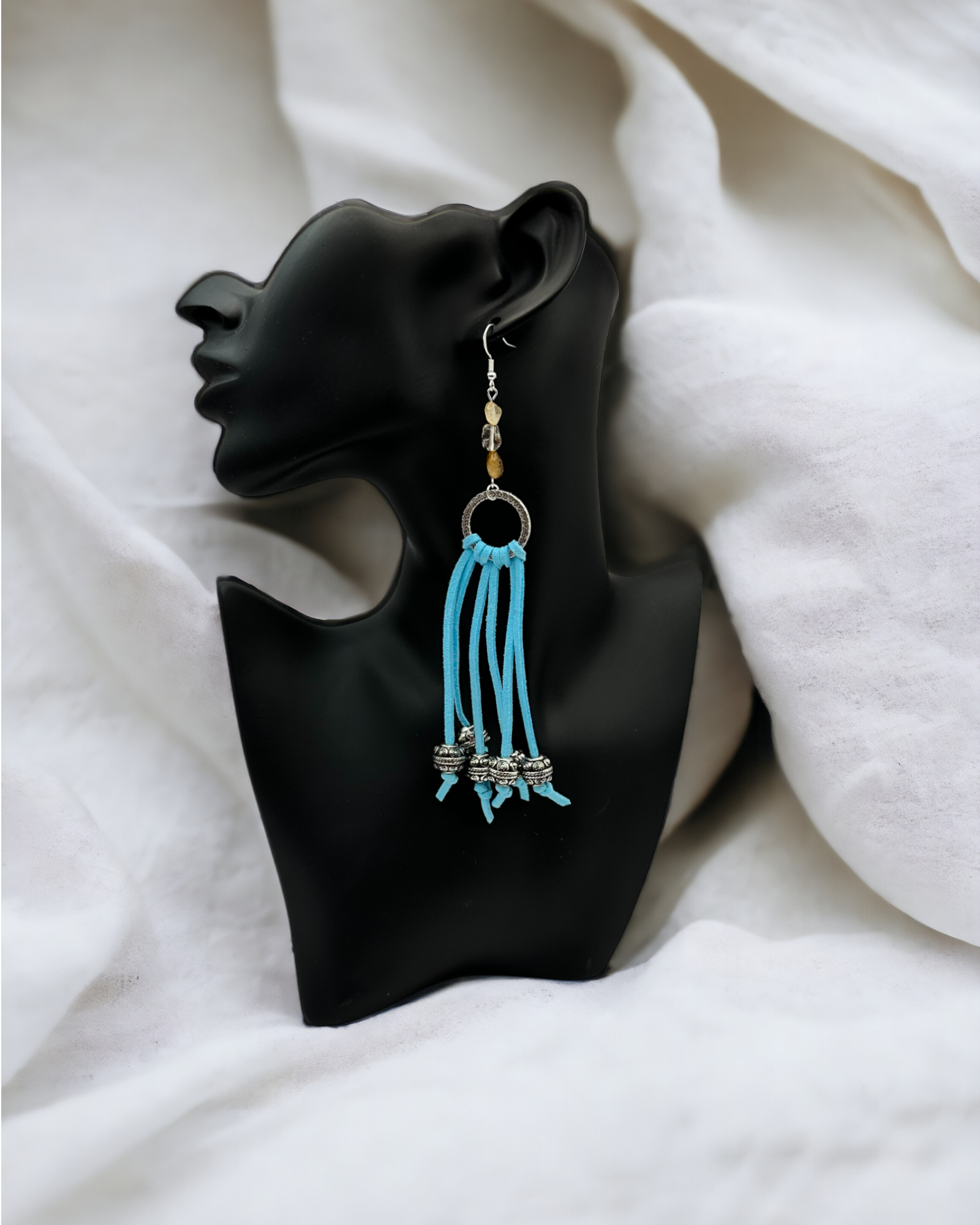 Add some bohemian flair to your jewelry collection with these stunning Citrine and Leather Fringe Dangle Earrings. Handmade with care, these earrings feature beautiful turquoise leather fringe, complemented by antique silver beads and citrine nuggets. The earrings hang gracefully from 23mm silver rings and come with 925 sterling silver plated fishhook ear wires. Perfect for any occasion, these unique earrings are sure to become a favorite in your collection.