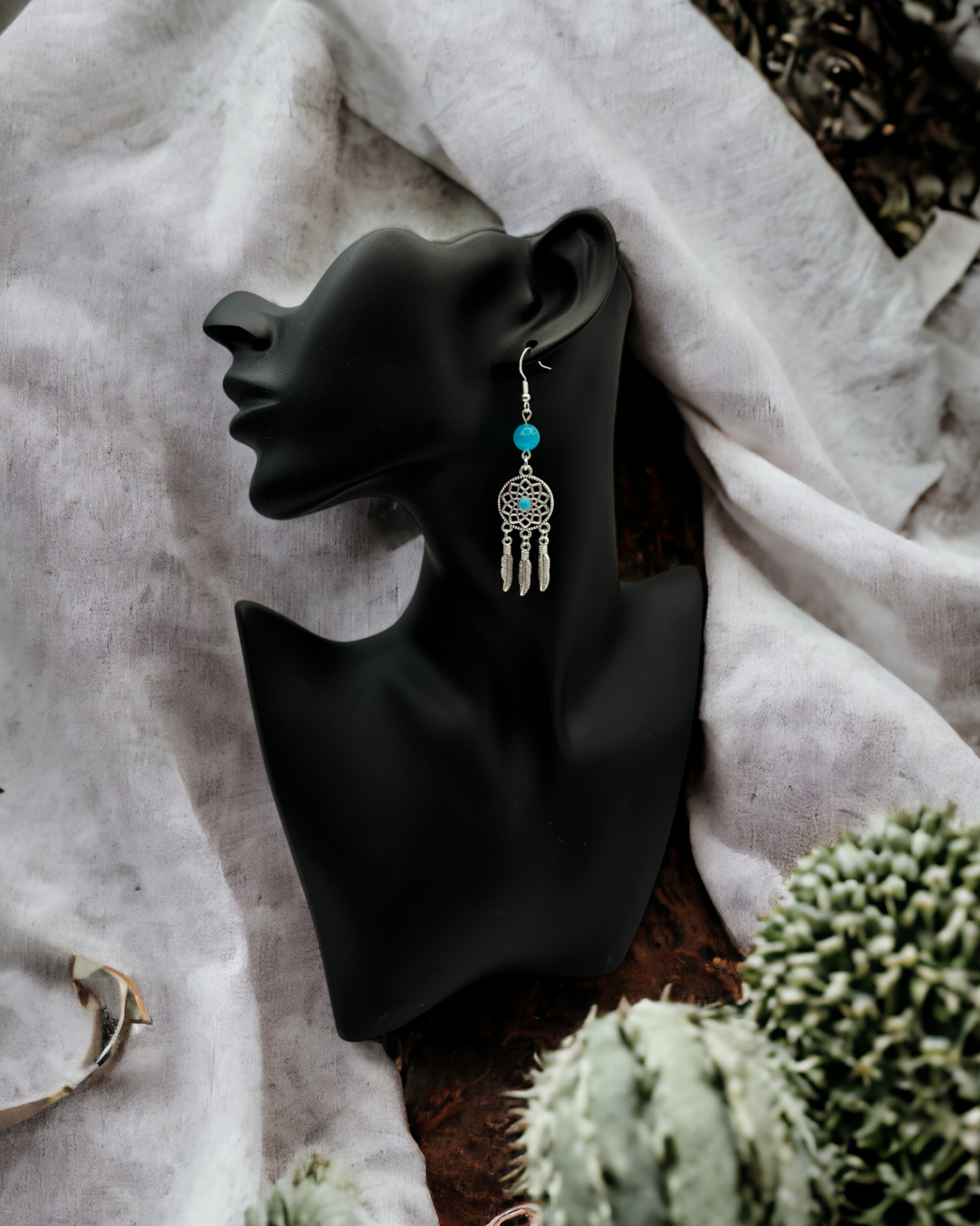 These stunning Dreamcatcher earrings are handmade with feathers and Amazonite crystals. The dreamcatcher design is both stylish and symbolic, making them perfect for any occasion. They come with 925 sterling silver plated fishhook ear wires, ensuring they are hypoallergenic and comfortable to wear. The unique combination of the dreamcatcher and Amazonite crystals makes these earrings a must-have for any jewelry collection.