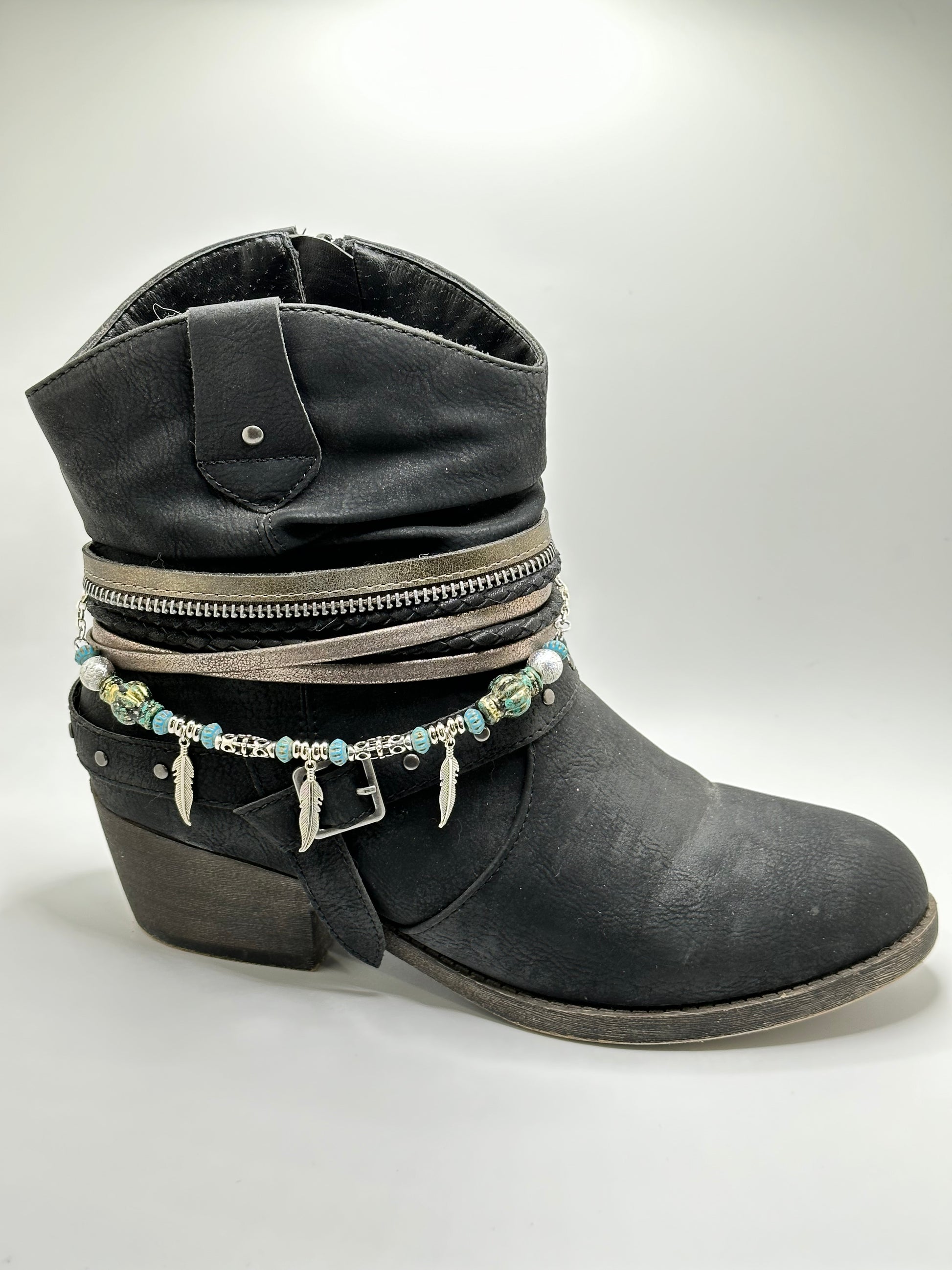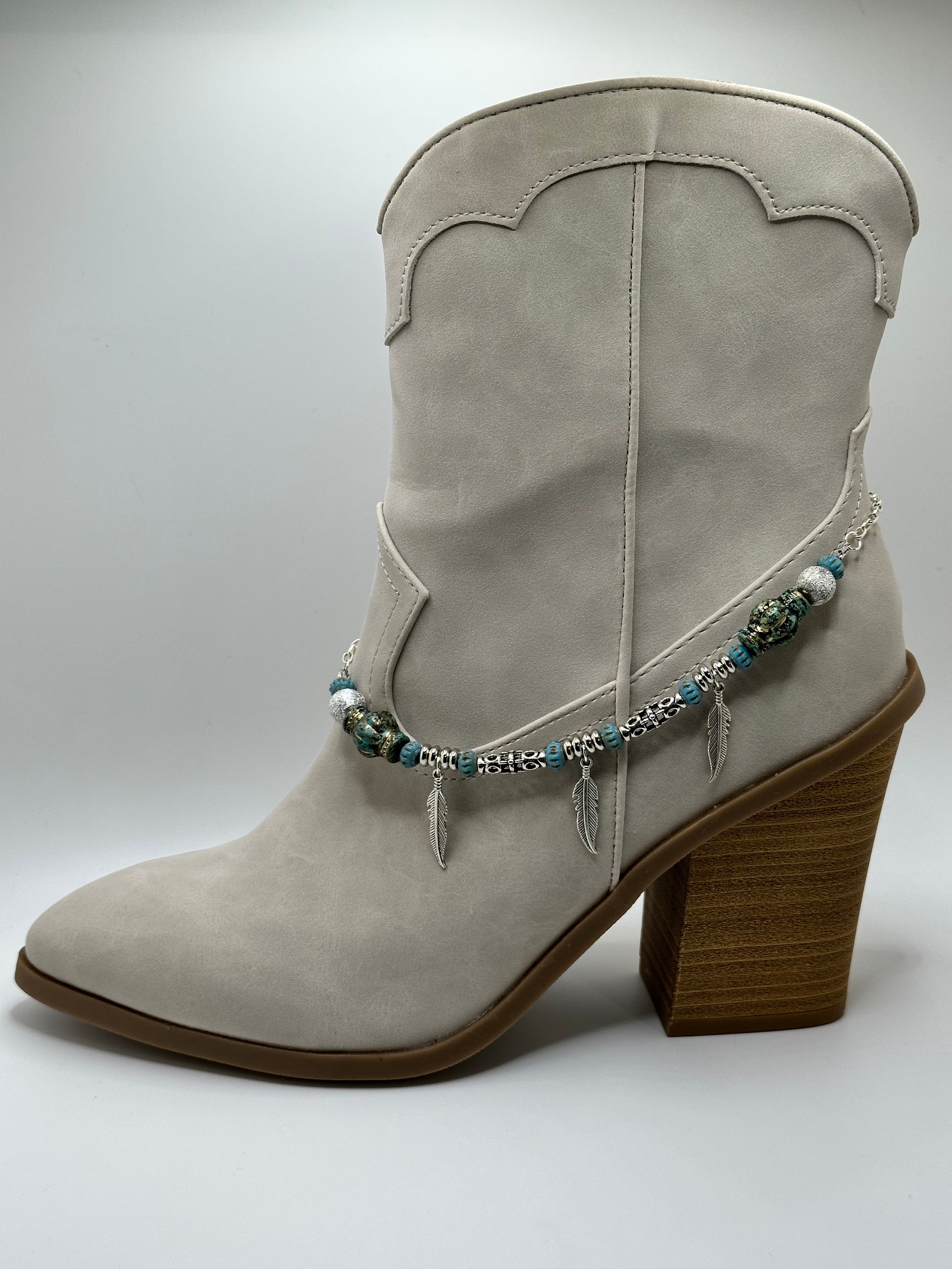 Unique Materials: Crafted from a mix of metal and acrylic beads, along with charming metal feathers, our boot jewelry boasts a distinctive design that sets it apart. The turquoise blue and silver color palette adds a pop of color and vibrancy to your ensemble, making a bold fashion statement.