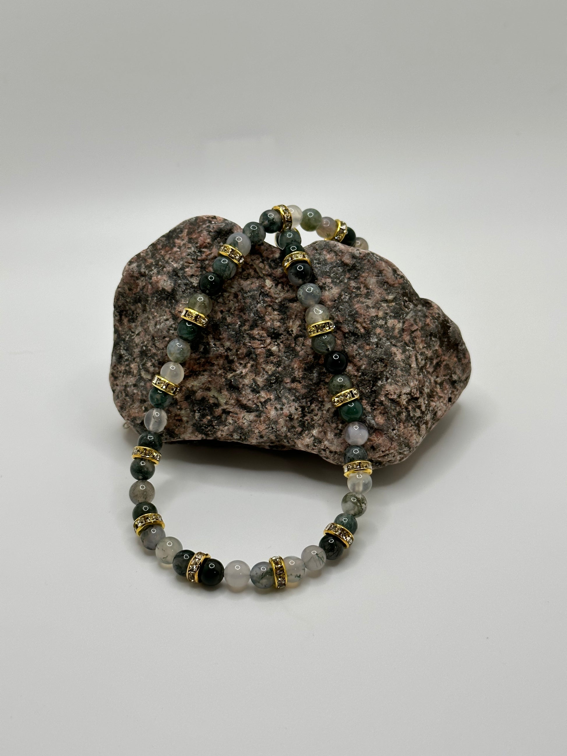 Nature-Inspired Design: Our necklace features a stunning arrangement of 6mm moss agate gemstones, meticulously selected for their enchanting green hues and intricate patterns. These natural stones are complemented by gold rhinestone spacers, adding a touch of luxury and sophistication to the piece.