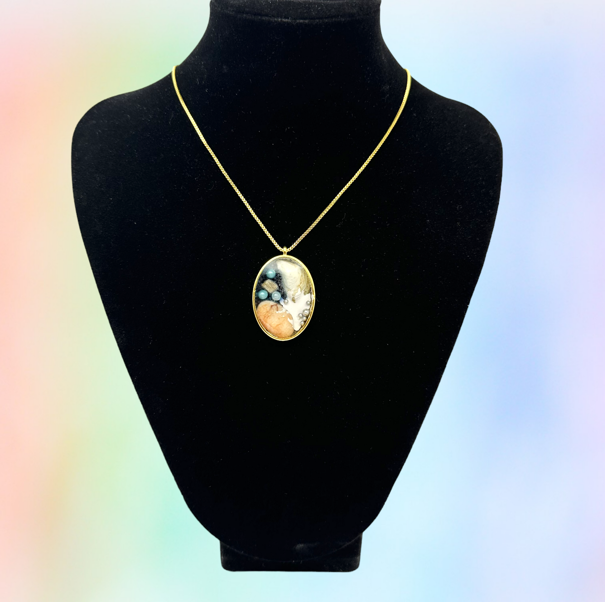 Introducing our captivating handmade necklace, a beautiful representation of the ocean's waves and bubbles, inspired by the tranquility of peaceful lakes or beaches. This exquisite piece features beautiful stones and a delicate shell, all centered around a gold oval bezel that adds an elegant touch to the design. The necklace is accompanied by a 20" gold-filled box chain, making it the perfect accessory for any occasion. Add this unique piece to your jewelry collection today and experience the calming presence of water delicately wrapped around your neck.