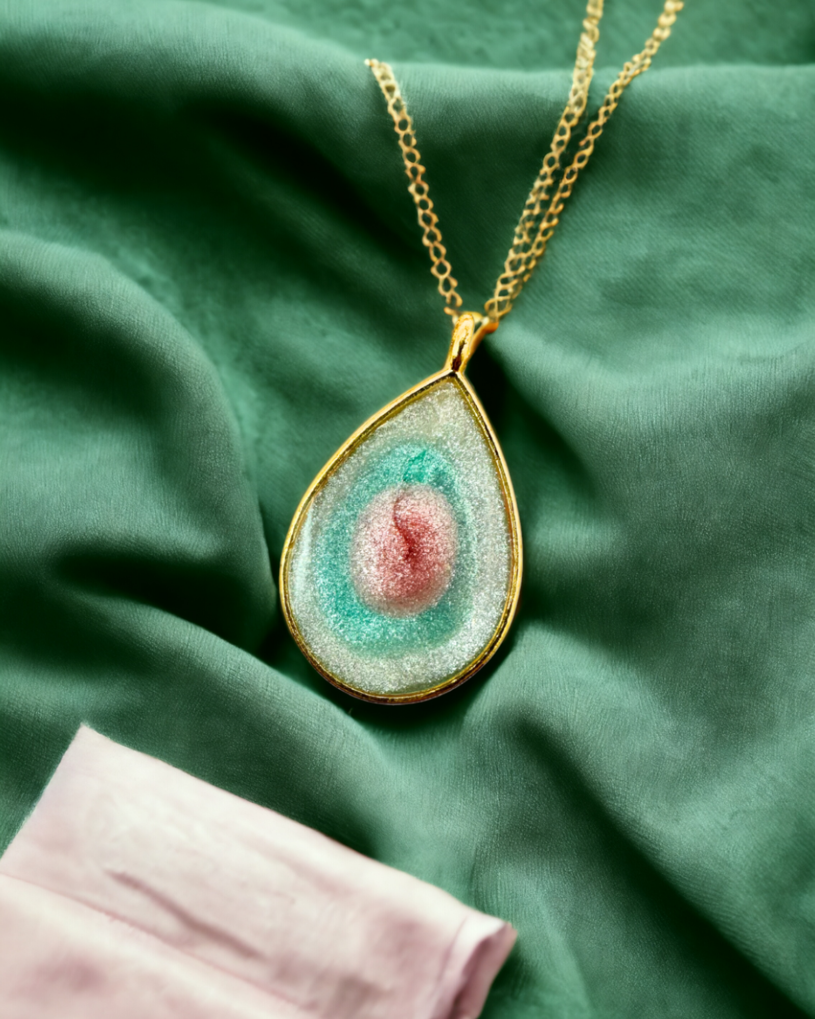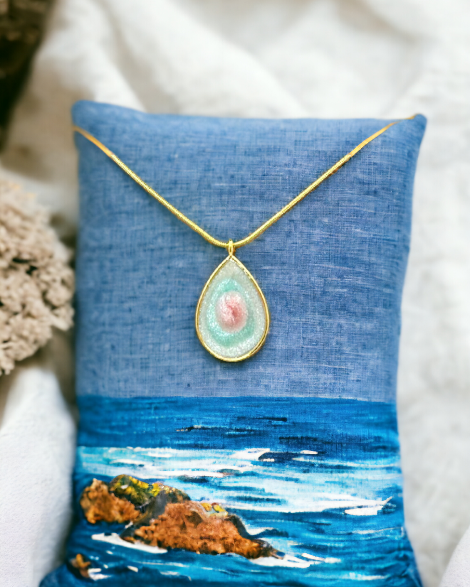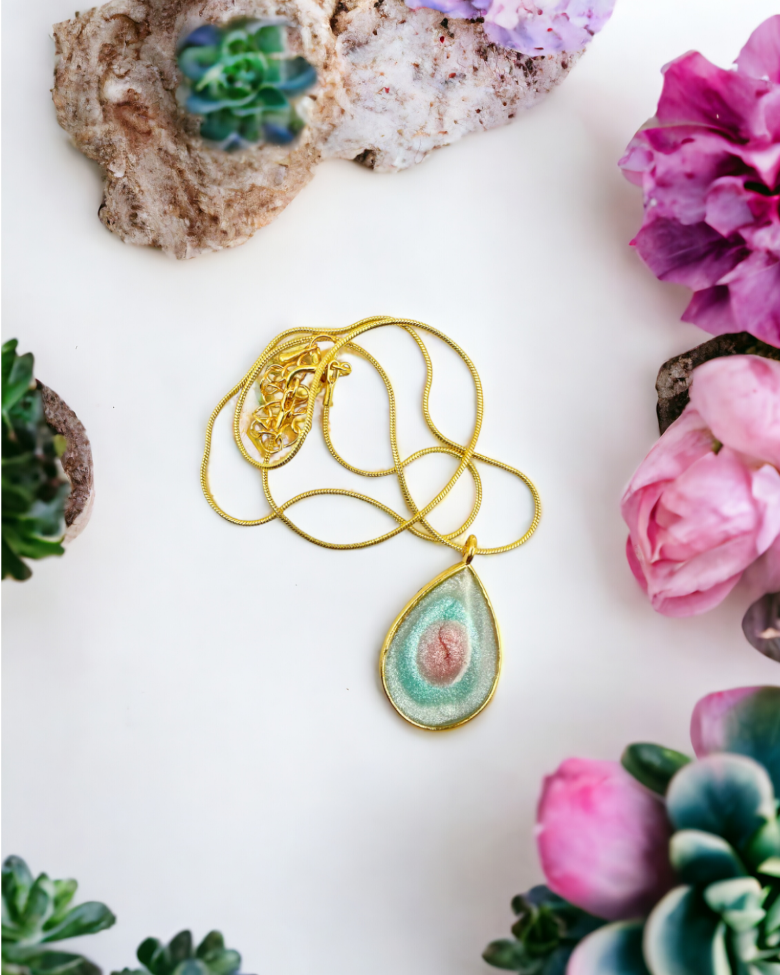 This handmade Pink and Turquoise Swirl Pendant is a stunning addition to any jewelry collection. Made with UV resin, the swirling colors of pink and turquoise are encased in a gold bezel for a luxurious look. The pendant hangs on a 16" 925 sterling silver gold-plated chain, making it the perfect length to wear with any outfit. Despite its bold appearance, this pendant is lightweight and comfortable to wear all day. Add a pop of color to your jewelry collection with this unique and eye-catching pendant.