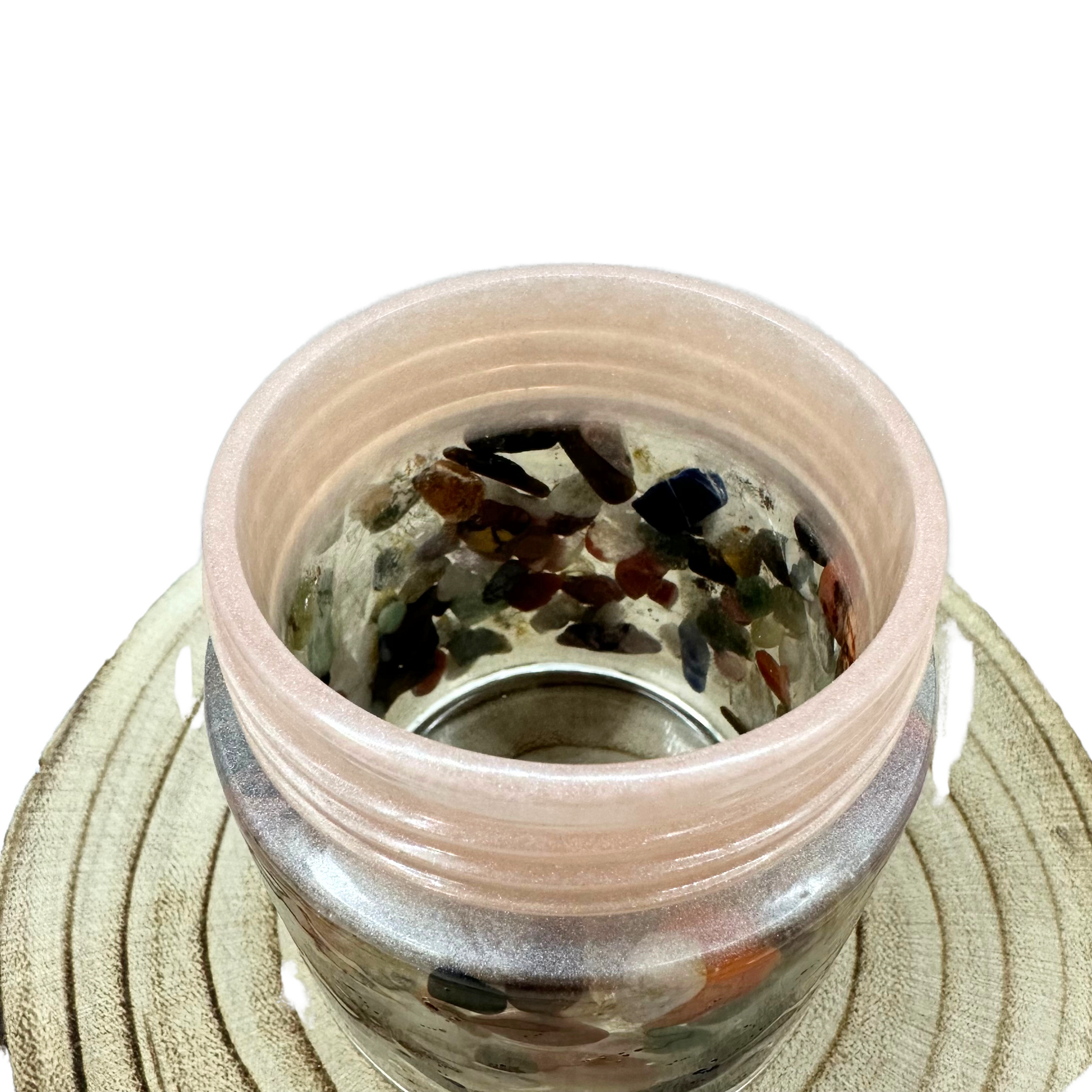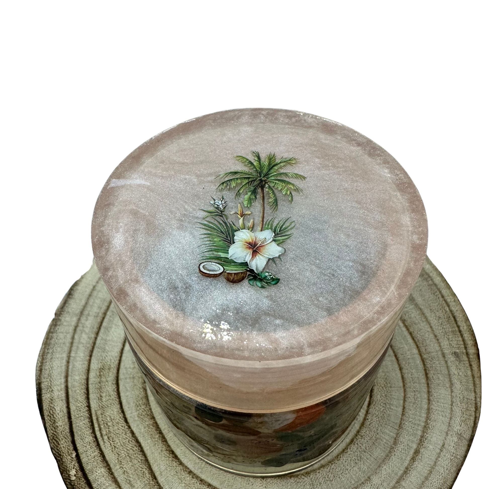 Transform any space into a masterpiece with our handmade, Pink Resin Gemstone Jar. This stunning jar boasts a beautiful pink resin adorned with an array of colorful gemstones, accented by a palm tree and flower design on the lid. Measuring 6 inches in diameter and 3 1/2 inches tall with the lid, it's the perfect addition to elevate your home decor and add a touch of elegance and charm. Indulge in the beauty and vibrancy of this unique gemstone jar!