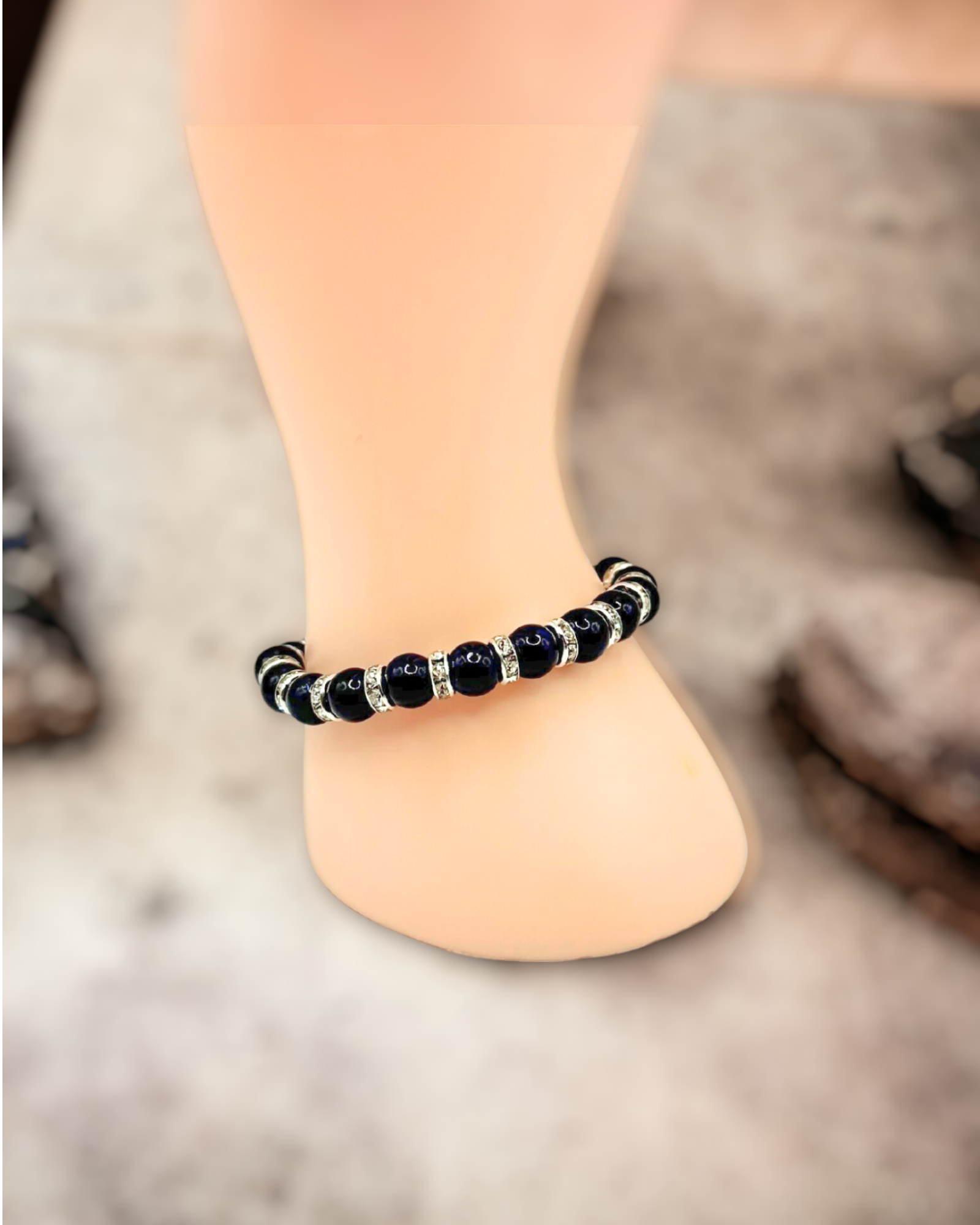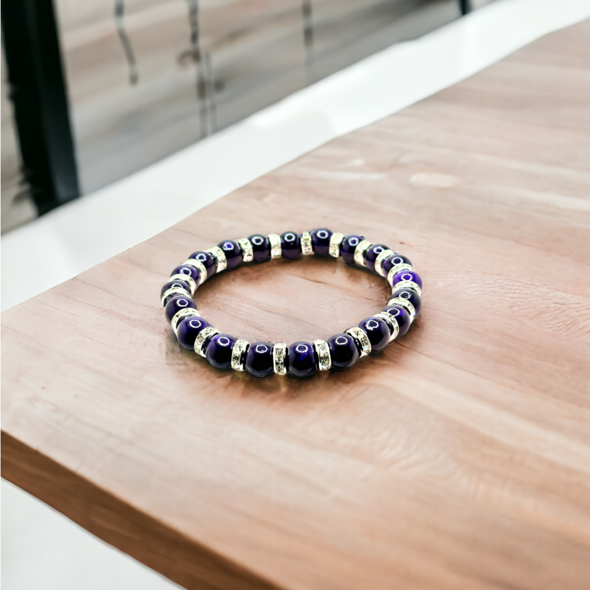 Design: The bracelet features a sleek dark purple band, adorned with Riverstone gemstones and accented by antique silver-finished rhinestone spacers. The shimmering silver rhinestones gracefully wrap around the wrist, catching the light with every movement.