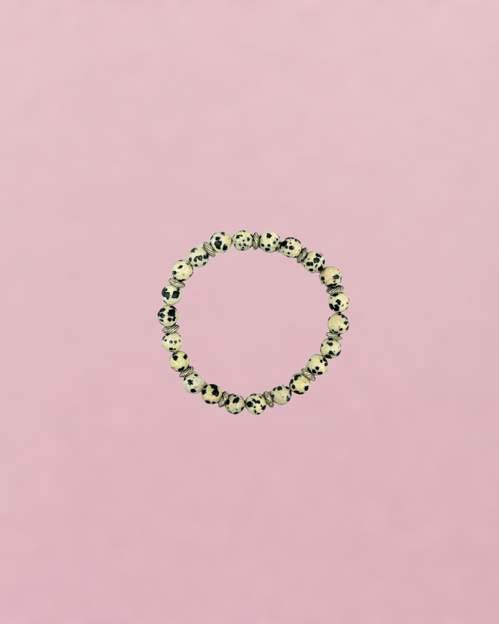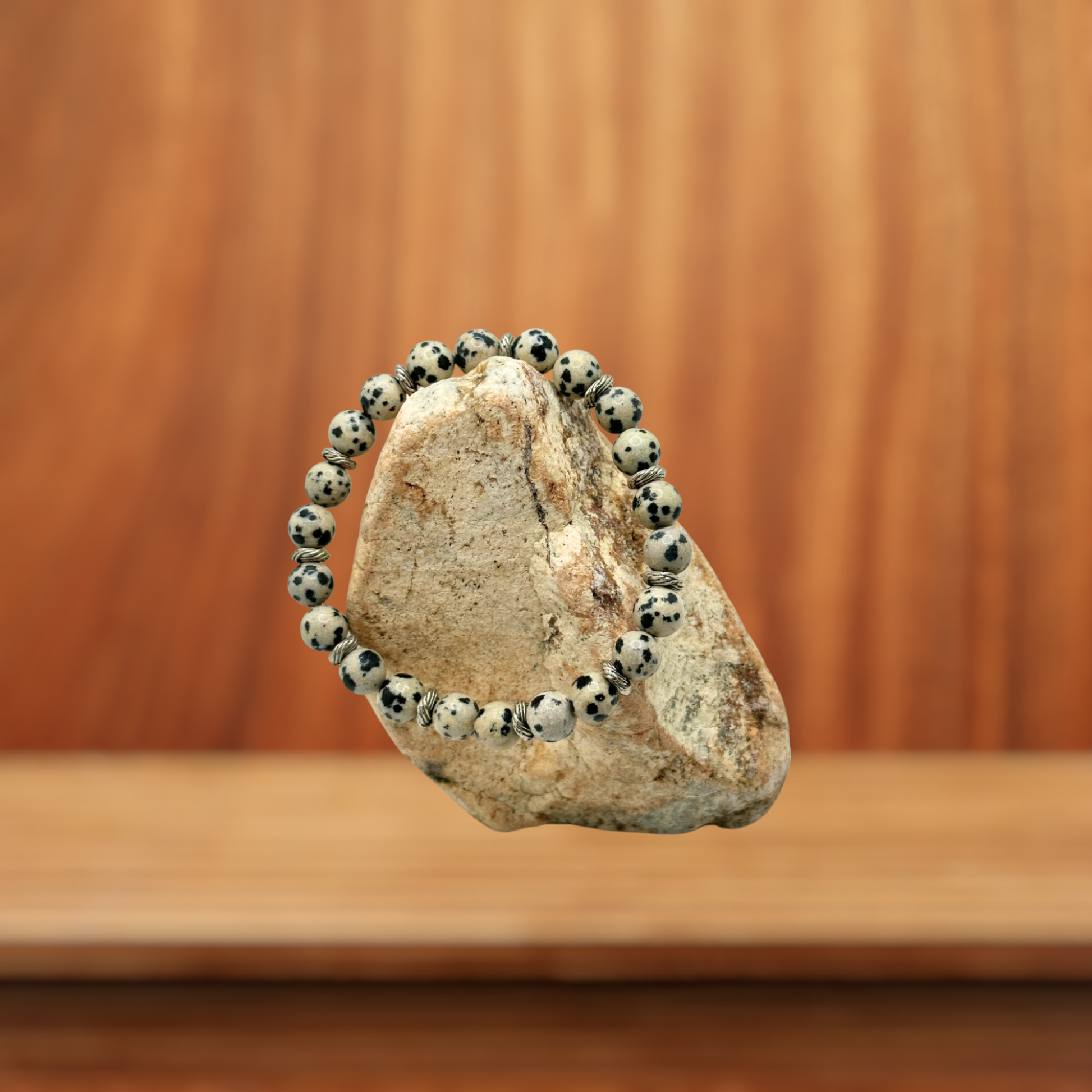 Embrace the playful elegance of Dalmatian Jasper—a timeless piece that not only enhances your style but also carries the potential to bring positivity and tranquility to your life. Enjoy the beauty of simplicity with this exquisite bracelet.