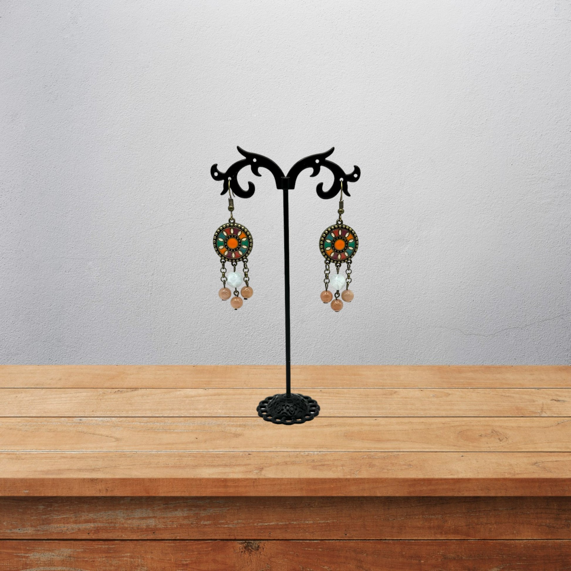 Introducing our stunning Sunstone and Aquamarine Aztec Earrings, meticulously handmade with attention to detail. The colorful Aztec metal focal is the focal point of these unique earrings, accentuated by 10mm faceted aquamarine gemstone beads and 6mm sunstone gemstone beads. The combination of these vibrant gemstones creates a striking and eye-catching look that is sure to turn heads. Finished with bronze ear wires, these earrings are not only beautiful, but also durable. Elevate your outfit with these unique and colorful earrings that are perfect for any occasion.
