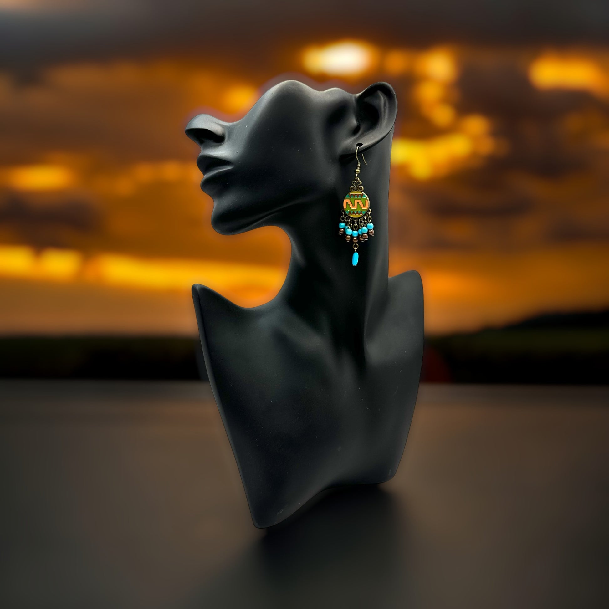 Add a touch of ancient allure to your jewelry collection with our Turquoise and Bronze Aztec Earrings. Handmade with meticulous attention to detail, these earrings are designed to be lightweight, ensuring comfort for all-day wear. The Aztec focal point is highlighted by 4mm turquoise gemstone beads, accented with 4mm antique copper-finished steel brown beads and turquoise puffed gemstones, creating a captivating vintage feel.