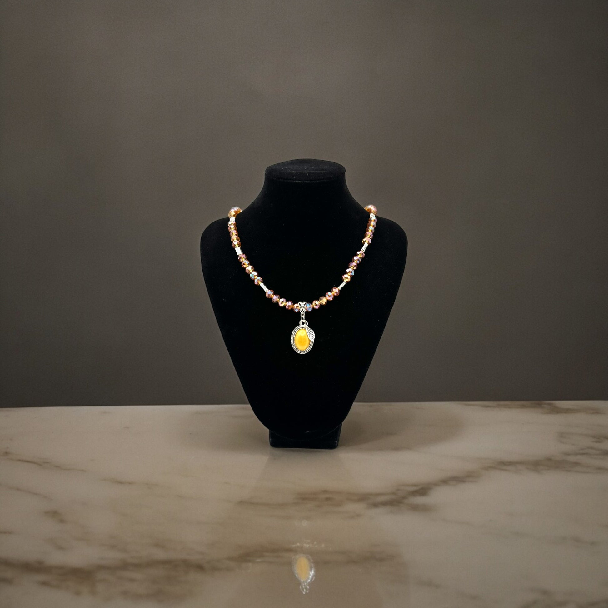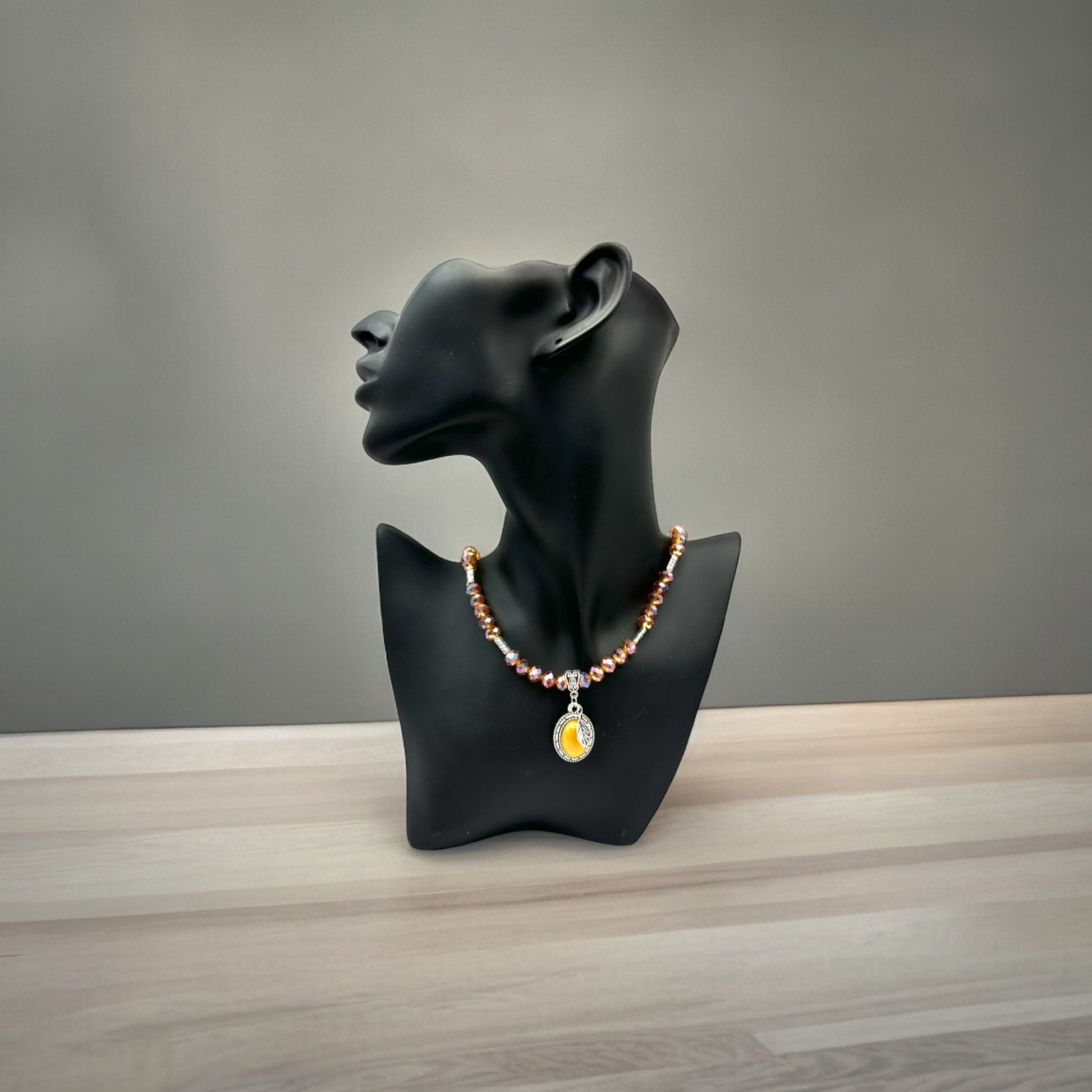 Add a touch of timeless elegance to your ensemble with our handmade Glass Crystals Necklace with Resin Cabochon Pendant. The pendant showcases a stunning resin cabochon set in stainless steel, complemented by an antique silver charm and accented with Tibetan silver metal beads for an added vintage allure. Adorned with 8mm Wine Smoke-colored rondelle glass crystals, the necklace exudes a sophisticated and eye-catching appeal.